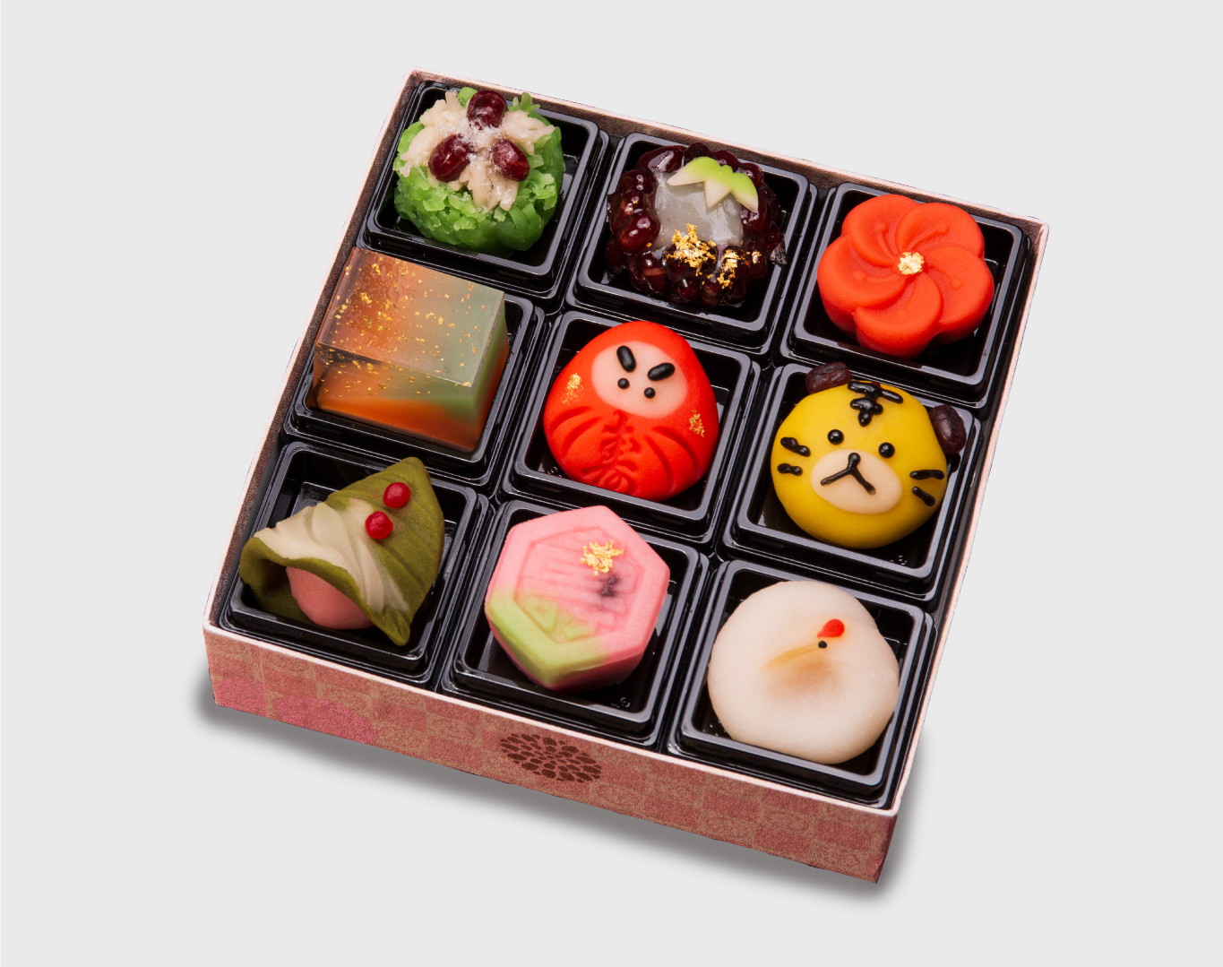 松・若竹・ねじり梅・御題菓「窓」・だるま・干支菓「とら」・千両・亀・鶴
